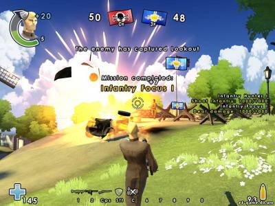 Название: Battlefield Heroes PC Версия игры: Жанр: Онлайновый экшен Мультиплеер: Интернет Разработчик: Digital Illusion Издатель: Electronic Arts Дата выхода: 25 июня 2009 Сайты игры: http://www.battlefield-heroes.com Минимум: 1 ГГц, 512 Мб, 64 Мб видео Рекомендуем: 2 ГГц, 1 Гб, 128 Мб видео Battlefield Heroes – онлайновый шутер по правилам Battlefield. С простыми и понятными правилами, невысоким порогом вхождения, но в то же самое время – с увлекательным игровым процессом, способным затянуть на долгие недели. Самое же приятное – играть можно совершенно бесплатно, деньги здесь тратятся лишь на некоторые дополнительные вещи. Серия Battlefield по праву считается одним из пионеров жанра сетевых командных шутеров – первая игра вышла в уже достаточно далеком 2002 году. В основу правил положили заметно переработанную систему domination, которую мы тогда уже могли видеть, например, в Unreal Tournament. Все достаточно просто. Есть две стороны. Есть карта, по которой разбросан набор захватываемых позиций. Сторона, которая удерживает большее их количество, получает шанс на победу. Кроме того, на позициях время от времени появляется техника и возрождаются погибшие в бою союзники. Эти правила (при должной реализации) оказались практически идеальными для командного шутера. С одной стороны, освоить их и сориентироваться на карте – очень несложно. С другой – для уверенной победы требуется хотя бы минимальное командное взаимодействие. Поэтому нет ничего удивительного в том, что за прошедшие годы в разных частях Battlefield менялись в основном графика и временной период (начиная со Второй мировой и заканчивая недалеким будущим), правила же, за исключением некоторых мелочей, оставались теми же самыми (порой разработчики, конечно же, пытались перевернуть все с ног на голову, добавив какой-нибудь новый режим, но раз за разом натыкались на полное непонимание пользователей). Небольшим исключением стала лишь вышедшая на консолях Battlefield: Bad Company, которая оказалась качественным однопользовательским боевиком, с полноценной кампанией и сюжетом. На фоне этой стабильности Battlefield Heroes чуть ли не самая новаторская часть за всю историю существования серии. Ведь перед нами – первая Battlefield-игра, целиком и полностью заточенная на онлайн. Действие разворачивается в шутливо изображенных декорациях Второй мировой, на просторах которых сражаются Королевская армия (англичане) и Национальное войско (немцы). Начать играть очень просто – пожалуй, перед нами самая простая игра за всю историю Battlefield. Создаем аккаунт на официальном сайте, скачиваем бесплатный клиент (тут есть некоторые нюансы, но о них позже), создаем персонажа – и в бой! Сразу же дает о себе знать ориентация на онлайн: игра сама подберет вам сервер, причем сделает это таким образом, чтобы вокруг оказались противники примерно такого же уровня развития. Классов в игре пока три: солдаты, гренадеры и коммандос. Зато у каждого – огромный ассортимент возможностей. Система чем-то похожа на «большие» MMORPG – по низу экрана идет панелька со скиллами, которые активируются цифровыми клавишами и требуют некоторое время на «перезарядку». Щит позволяет увереннее чувствовать себя под огнем, аптечка лечит всех окружающих и т.д. Впрочем, про использование основного оружия забывать, конечно же, не стоит. Присутствует и управляемая техника: джипы, танки, самолеты и т.д. Другая особенность игры – постоянное разви